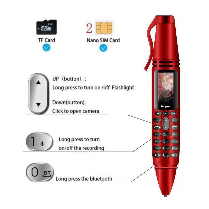 Un téléphone mini format stylo, élégant et multifonction, parfait pour les déplacements, avec écran LED et fonctionenregistrement. Son design à clip rend son utilisation simple et pratique.
