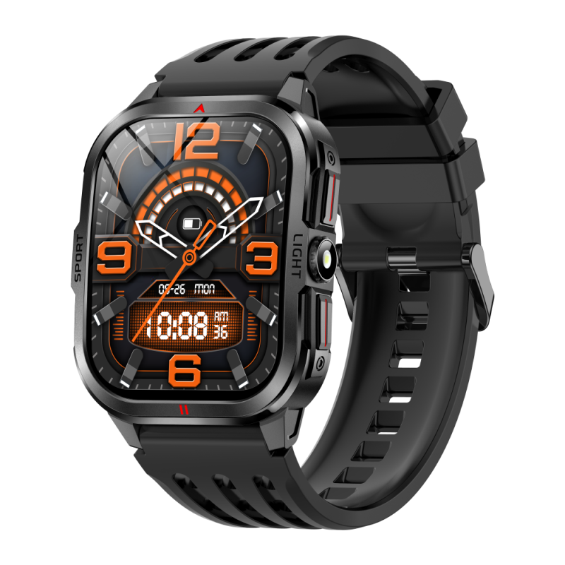 Montreconnectéerobuste avec grand écran 2.01’’, parfaite pour les activitéssportives et outdoor. Étanche IP68, elle propose un suivi santé complet et des appels Bluetooth.